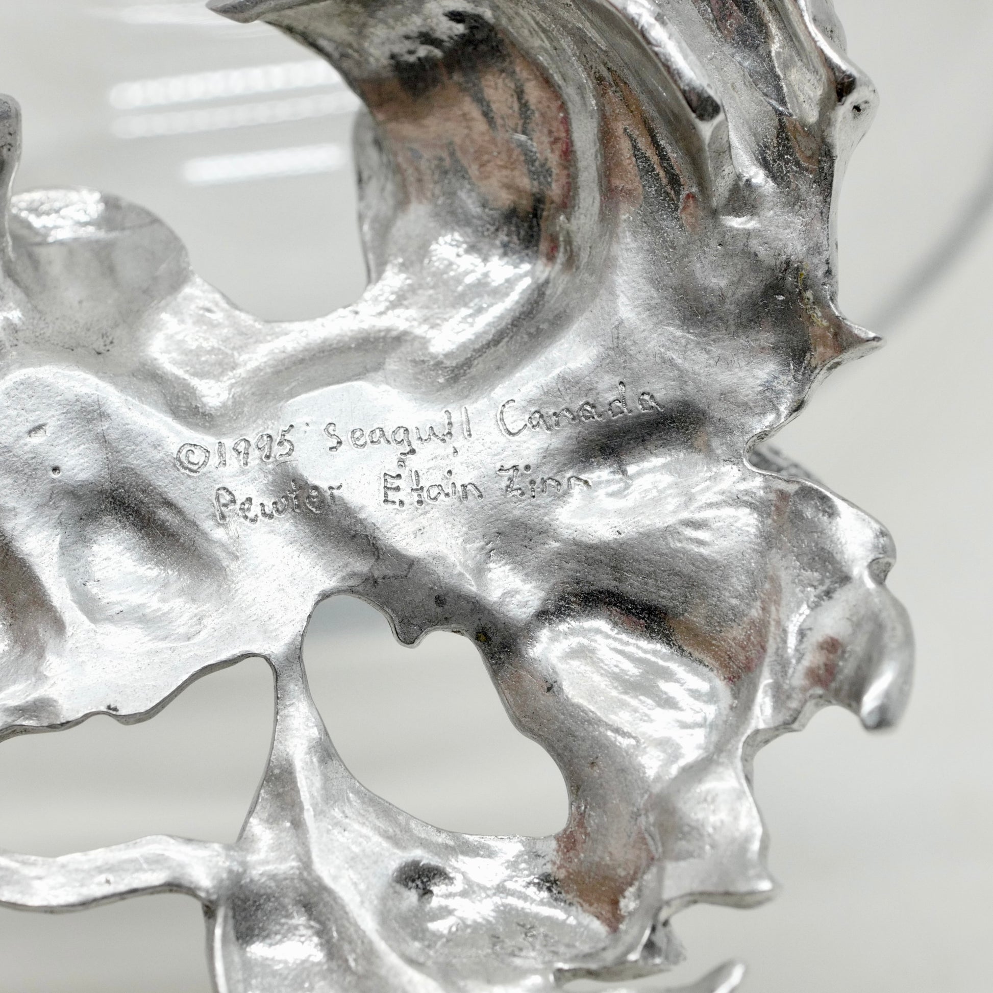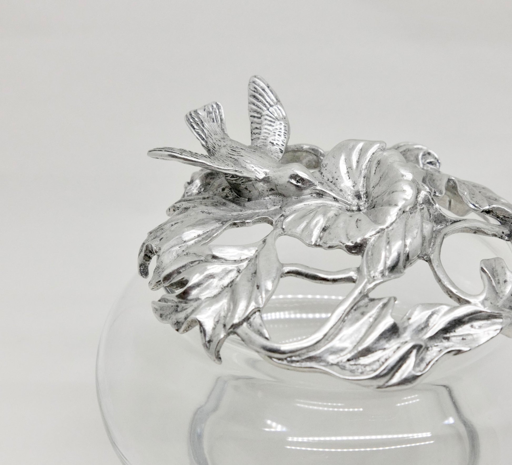 This elegant piece was discovered at a vintage market in Zurich and features a beautifully crafted pewter lid designed by Seagull Pewter Canada in 1995. The lid showcases an intricate hummingbird and floral motif, perfectly complementing the clear glass vase. This combination makes it both functional and decorative, ideal as a centerpiece, jewelry holder, or for serving chocolates and dried fruits.
