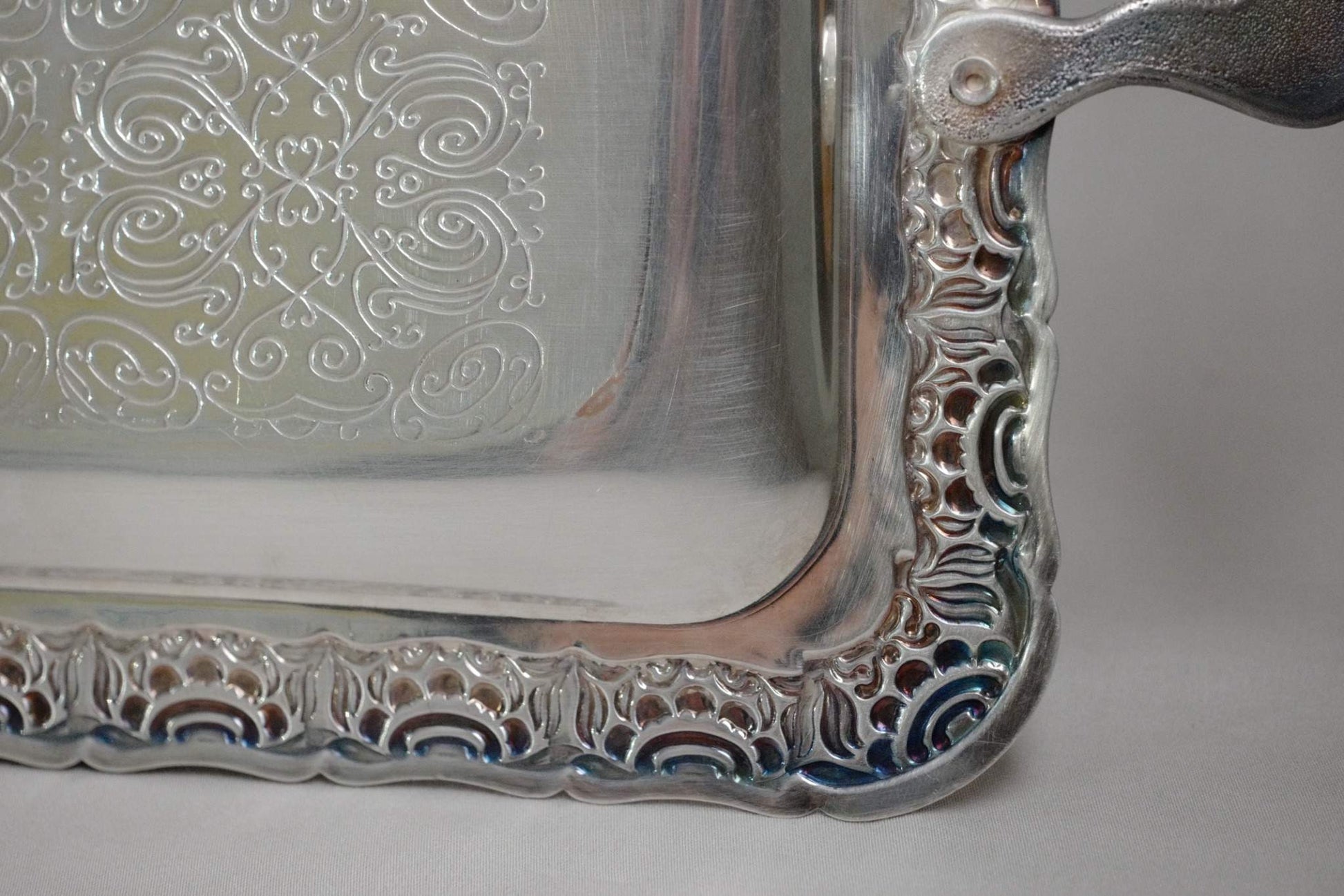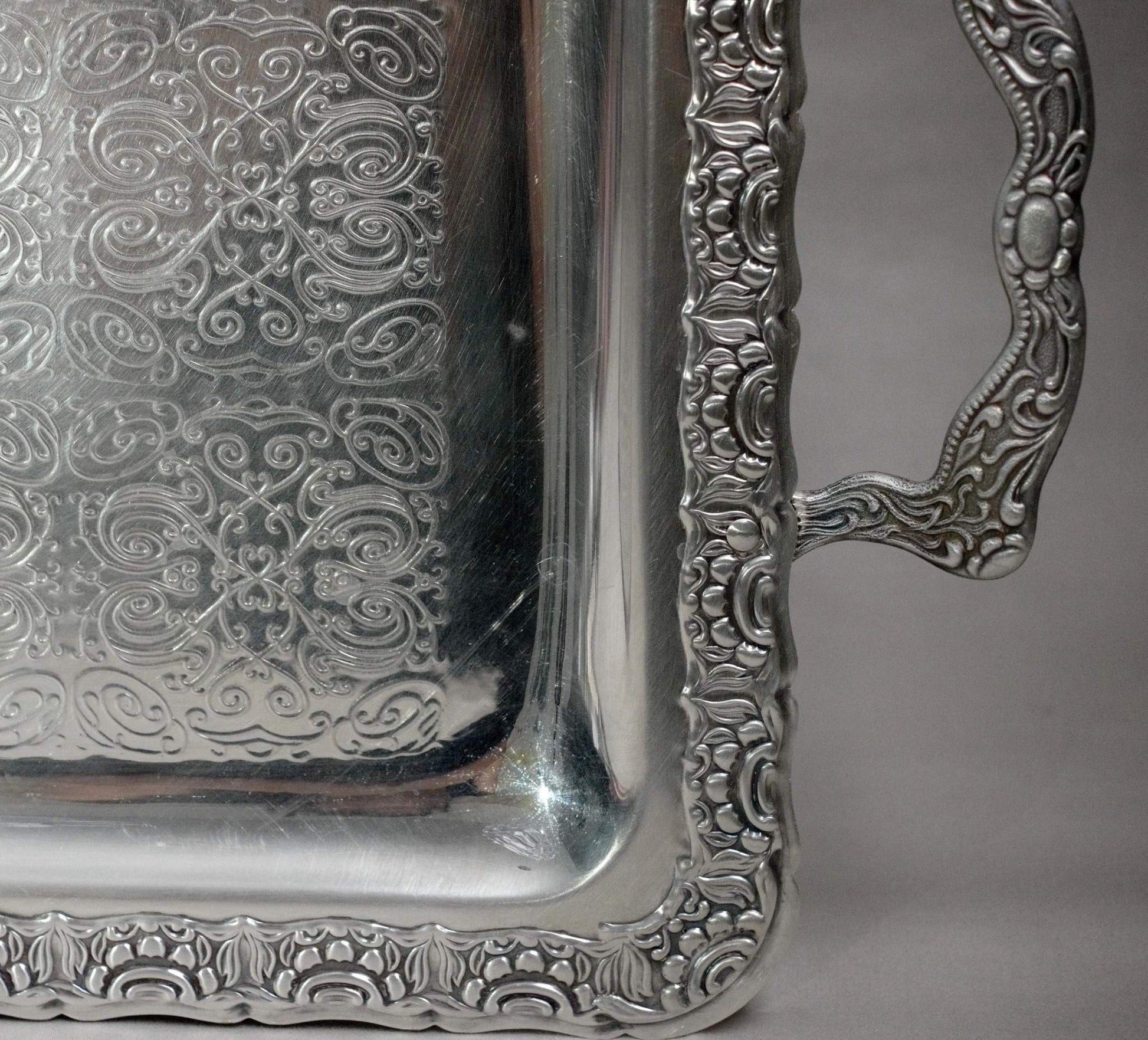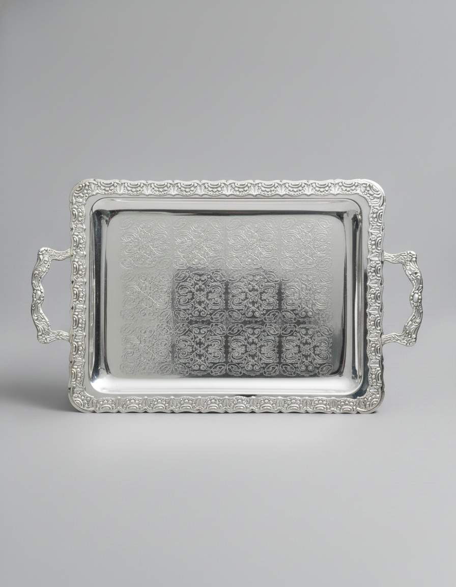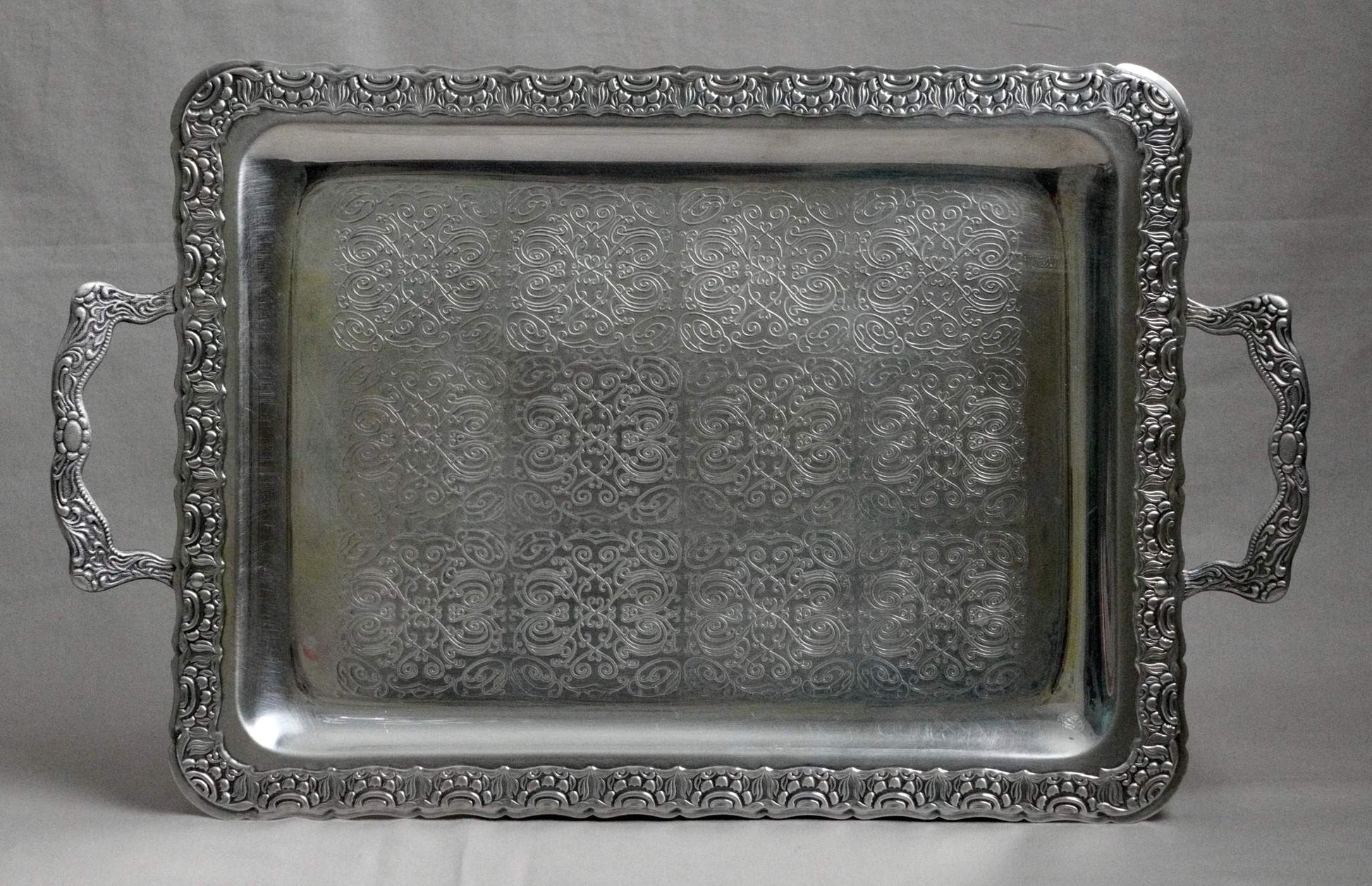 Elegant rectangular silver-plated tray with ornate handles and fine engraved pattern.